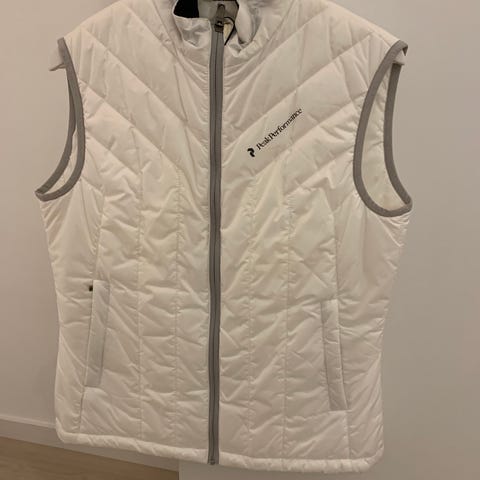 Nike vest for dame i størrelse M. Vesten er hvit og laget i polyester. Den har høy krage og glidelås i front. Modellen har stikklommer i sidene og lett vattert, quiltet innside.