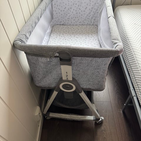 Kinderkraft bedside crib for spedbarn. Sengen er i en nøytral grå farge med myke tekstilkanter og metallben. Den kan plasseres inntil voksenseng for enkel tilgang til barnet om natten. Egnet som babyseng på soverom.