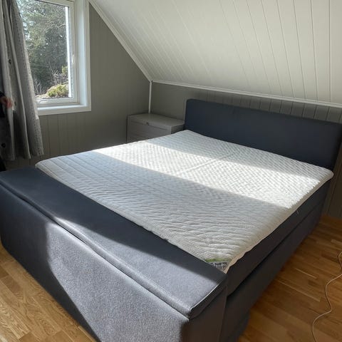 Sengen ble kjøpt ny i 2021. Tilsvarende Venus kontinentalseng 160x200 fra samme modellserie ligger i dag rundt 18 000 kr ny i butikk, og denne selges i tillegg med sengegavl og flere fasthetsalternativer.