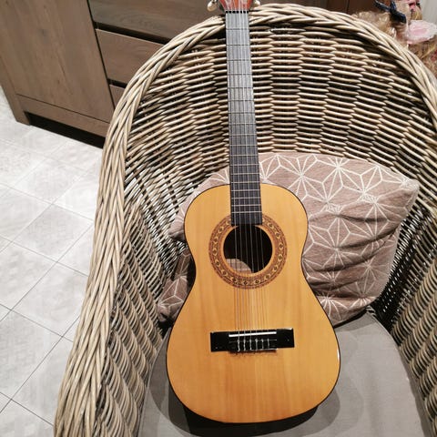 Megen fin gitar.er av merket everdeen.hel og meget fin gitar.kan følge med helt nytt trekk til gitar i prisen.