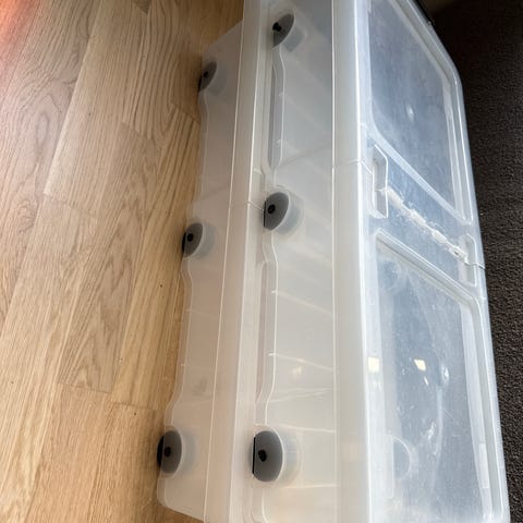 Orthex SmartStore Classic 35 oppbevaringsboks i gjennomsiktig plast med lokk. Boksen har et volum på 31 liter og måler ca. 72 x 40 x 20 cm. Den er utstyrt med små hjul under for enklere flytting.