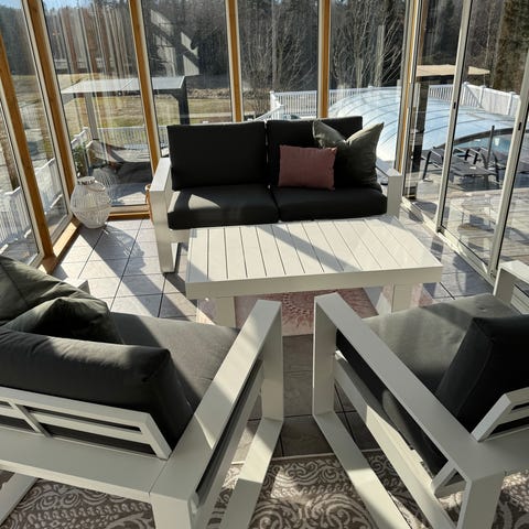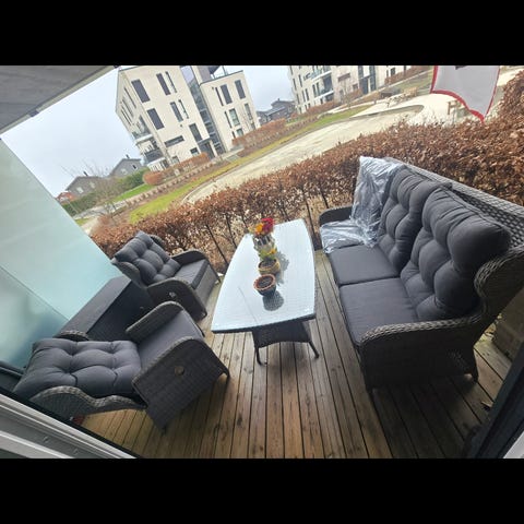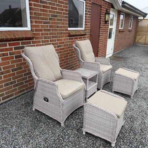 Hage/ terrassestoler med justerbar rygg, fotskammel til begge stoler og et lite bord med glassplate selges.