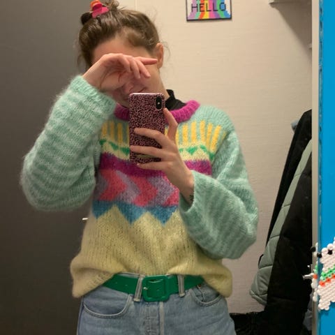 Strikket genser i mohair. Mosegrønn, fargen på bilde 2 stemmer mest. Passer S-L, lett strikket og faller pent.