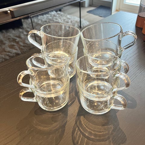 IKEA glasskrus i gjennomsiktig glass. Krusene har rund form med solid hank og er egnet til varme og kalde drikker som kaffe, te eller kakao. Enkle å stable og passer godt i de fleste kjøkken og serviser.