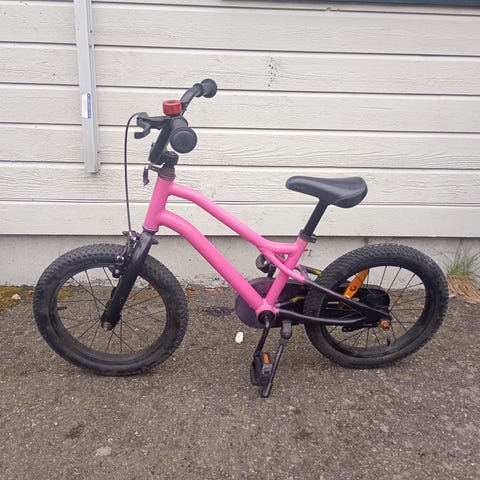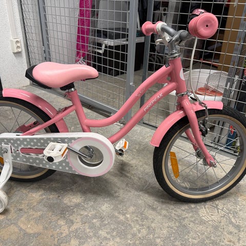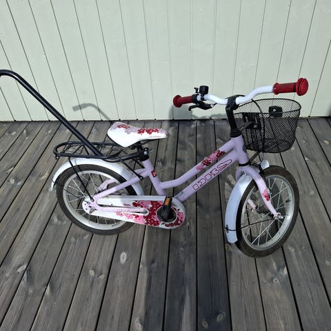Merida bella J 16 barnesykkel 16" i rosa farge med hvite detaljer. Sykkelen har kurv foran og bagasjebrett bak. Den er utstyrt med kjedekasse som dekker kjedet, samt pedaler med refleks. Passer for barn som bruker 16" hjulstørrelse.