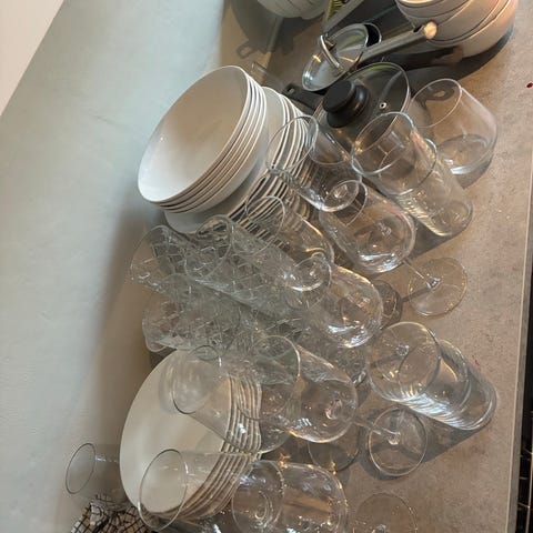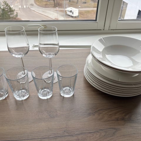 Rosendahl tallerkener i hvitt porselen. Grand cru. 4 dype (25 cm), 13 flate (23 cm), 10 flate (27 cm). 8 dessertskåler, 1 stor skåler, 1 medium skål, vannkaraffel, 10 glass. Selges samlet. Må hentes.
