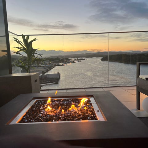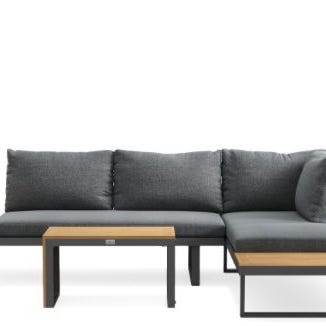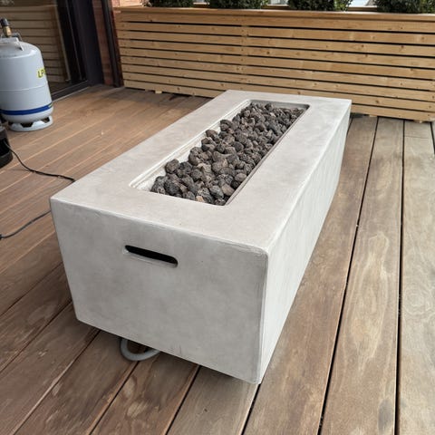 Cosi utebord med integrert gasspeis. Bordet har rektangulær form med svart overflate og åpen ramme i metall. I midten står en gassbrenner omgitt av herdet glass og dekorstein/kunstige vedkubber. Glassomrammingen er festet med metallbeslag. Boret er egnet som utebord på terrasse eller i hage, der gasspeisen gir lys og varme. Gassflaske plasseres i det lukkede feltet under bordplaten. Det kan forekomme synlige bruksspor på overflate og understell etter normal bruk utendørs.