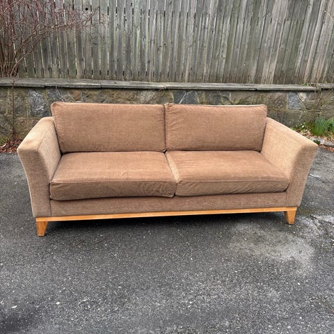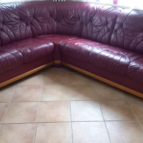En liten solid sofa med skinn-trekk som enkelt kan trekkes om, gis vekk. Du kan fint få den inn i en bil om du legger ned baksetene.