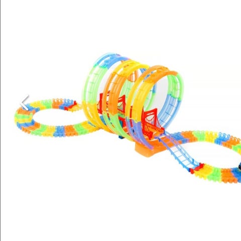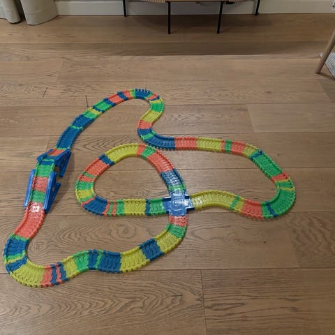 Clicktrax bilbane med bevegelige skinner og to selvgående biler. Følger også med deler til å bygge en bro. Bilene går på batteri og går av seg selv og lyser.