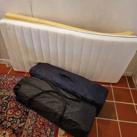 Hei, jeg leier ut en reiseseng med madrass, jeg har også fint senge tøy og dyne som kan leies ved et lite tillegg