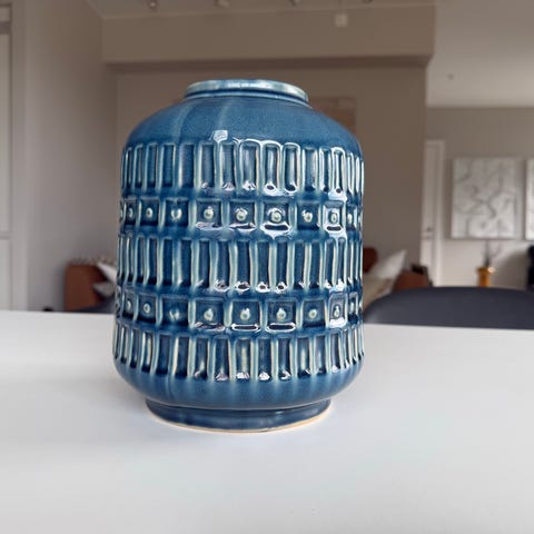 Avlangt fat med lett opphøyd kant og mønster i overflaten. Egnet til servering av frukt, snacks eller dekorative oppsatser. Kan også brukes som dekorasjonsfat på bord eller kommode. Laget av glasert keramikk som er enkel å tørke av og holde ren.