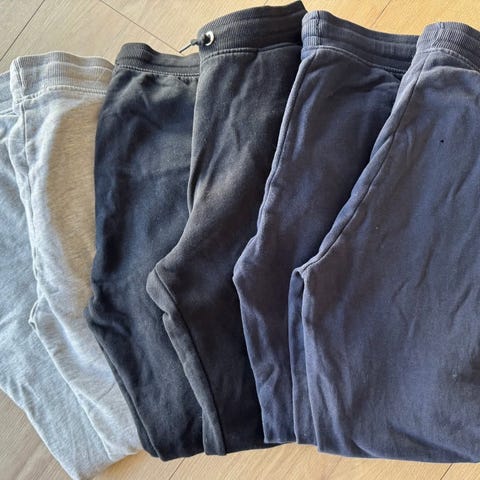 Pakken inneholder flere bukser (joggebukser og én jeans), gensere og hettegensere i nøytrale farger (grå, blå, svart og beige).