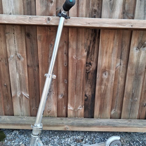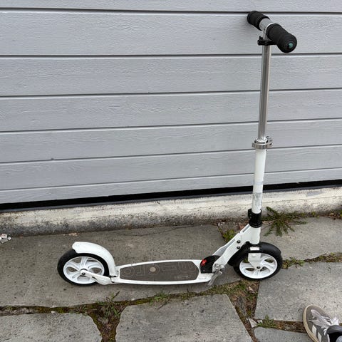 Sparkesykkel sammenleggbar i hvit farge. Modellen har store hjul foran og bak, fotbrems på bakhjulet og justerbart styre med skumgrep. Brettet har sklisikkert dekke. Egnet til bruk på jevnt underlag, for transport og fritidsbruk.