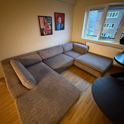 Sofaen har to store puter, med plass til fire personer. Den er både god å sitte i og god å ligge ned i. Putene er 65cm dype når ryggputene fjernes, så også mulig å bruke sofaen som gjesteseng.