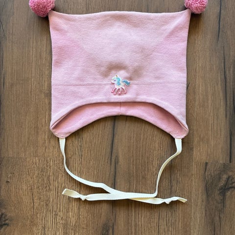 Nydelig rosa lue med tynt ullfor. Mummimotiv. Perfekt lue nå mot våren.