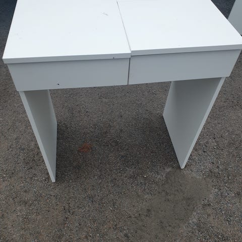 sminkebord for barn med tilhørende krakk. Bordet har tre speilflater, hvorav to kan vinkles, og en skuff under bordplaten for oppbevaring av småting. Ben på bord og krakk er i treverk, mens bordplate, speilrammer og sitteplate er i hvit utførelse. Passer som lekemøbel eller til enkel oppbevaring og speilplass på barnerommet.