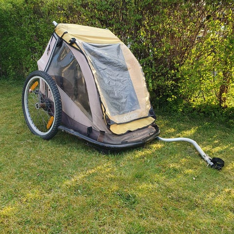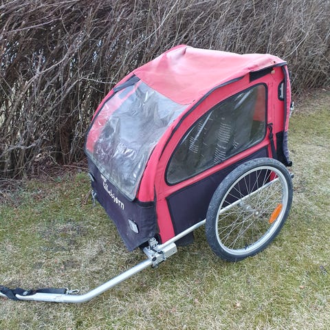 Sykkelvogn for barn med to seter i grå og rød tekstil. Vognen har transparent front med plastvindu og netting for beskyttelse mot vær og insekter, samt nettingfelt bak for lufting. Innvendig er det to sitteplasser med separate sikkerhetsbelter. Sykkelvognen har to store hjul bak og et drag foran for feste til sykkel.