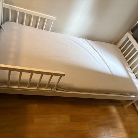 En IKEA-seng og madrass for barn. Størrelsen til sengen er 160cm i lengde og 70cm i bredde. Veldig pent brukt. IKEA-madrassen er også inkludert i kjøpet.