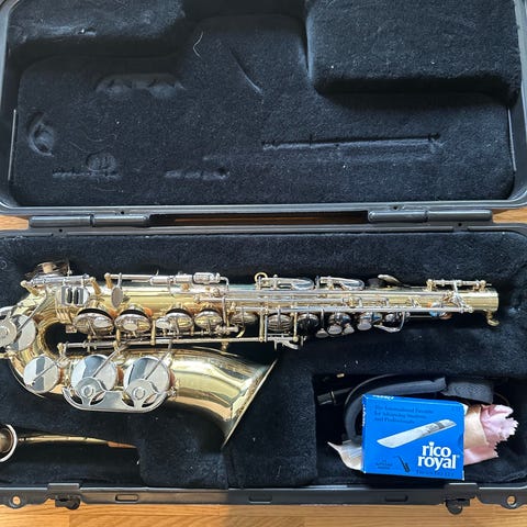 Instrumentet leveres i original hardcase med innvendig fôr. I kofferten følger det med munnstykke, hals og noen enkle vedlikeholdstilbehør som pusseskinn/klut. Saksofonen har lakkert messingkropp med klaffemekanikk i metall og perlemorlignende klaffeknapper.