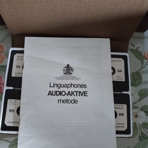 Komplett ubrukt Linguaphone Corso d’Italiano språkkurs i italiensk. Sett i koffert med trykt logo på lokket. Inneholder kurshefter og flere lydbåndkassetter plassert i skuminnlegg. Materialet dekker italienskkurs med tekstbøker og tilhørende lydopptak, egnet for selvstudium av italiensk språk. Kofferten er i mørk farge med gullfarget tekst og emblem på utsiden. Selges rimelig.
