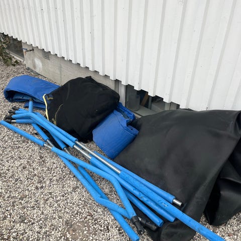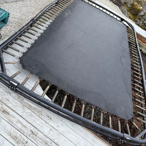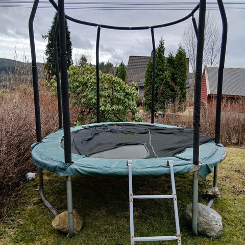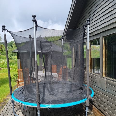 Rund trampoline 3,9m med sikkerhetsnett selges. Ca 10 år gammel. Demontert hver vinter. Mangler skumbeskyttelse rundt stengene for sikkerhetsnett. Ellers komplett.
