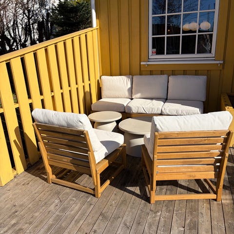 Selger 3 stk hardwood klappstoler fra Jutlandia med vendbare puter og hagebord med glassplate. Putene er alltid oppbevart inne. Stolene har armlener og regulerbar rygg og er jevnlig oljet. 1500 kr for hele settet
