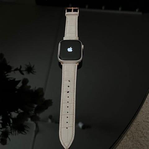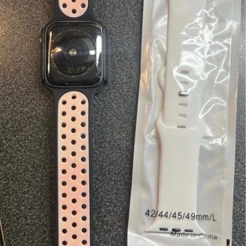 Apple Watch smartklokke med svart silikonreim. Klokken har rektangulær skjerm og digital krone på siden for navigasjon. Baksiden har sensorer for måling av aktivitet og puls. Reimen har flere hull for justering av passform. Egnet til daglig bruk, aktivitetssporing og varsler fra tilkoblet iPhone.
