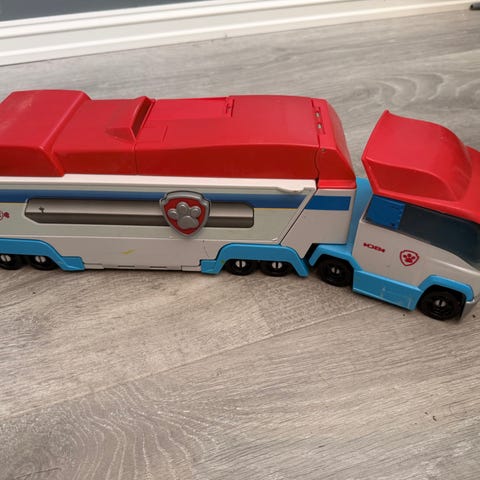 Paw Patrol leketøysbil i form av en stor lastebil. Modellen har flere hjul, åpne- og lukkbare deler på toppen og plass til figurer eller småleker inni. Fargene er hovedsakelig hvit, rød, blå og svart med gule hjuldetaljer. Egnet som lekekjøretøy for barn som liker Paw Patrol-universet.