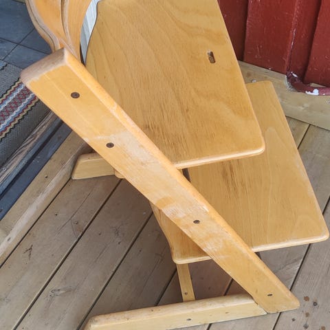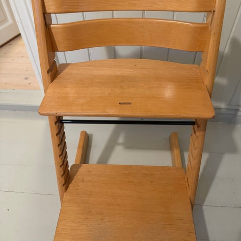 Stokke Tripp Trapp barnestol i tre med naturfarget finish. Stolen har justerbart sete og fotbrett som kan flyttes i høyden etter barnets størrelse. Klassisk design som gjør at barnet kan sitte i riktig høyde ved bordet. Egnet som barnestol fra småbarnsalder og oppover, avhengig av tilbehør og tilpasning. Laget i heltre med metallstag for stabilitet.