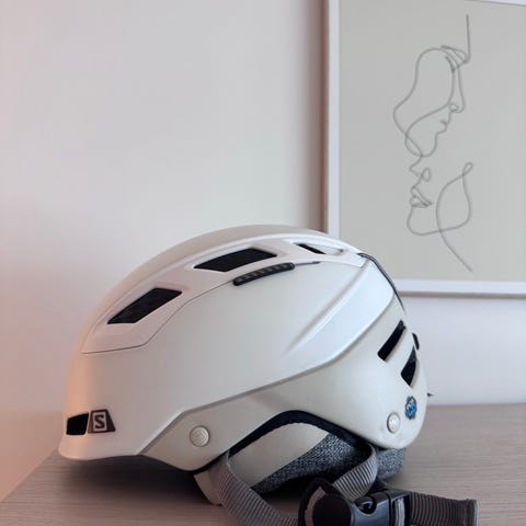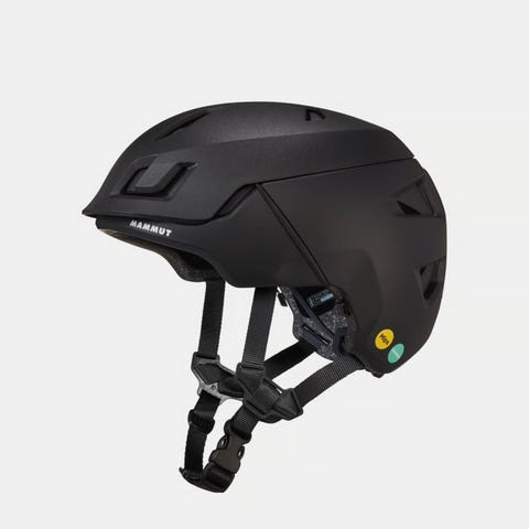 Hjelmen er svart med justerbar stropp under haken og regulering i nakken for bedre passform. Innsiden har støtdempende innlegg og polstring.