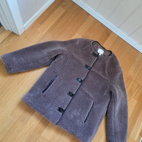 H&M jakke i fuskepels for dame i størrelse S. Jakken er brun og har myk, pelslignende overflate. Den har lange ermer, enkel åpning foran og lommer i sidene.