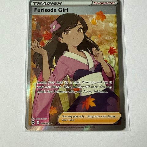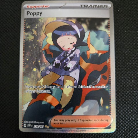 Pokémon Peonia samlekort. Kortet viser treneren Peonia på forsiden og standard Pokémon-bakside. Egner seg som del av en samling eller til bruk i Pokémon Trading Card Game. Eventuelle detaljer om utgave, språk og tilstand må vurderes ut fra bildene eller kortets trykk i virkeligheten.
