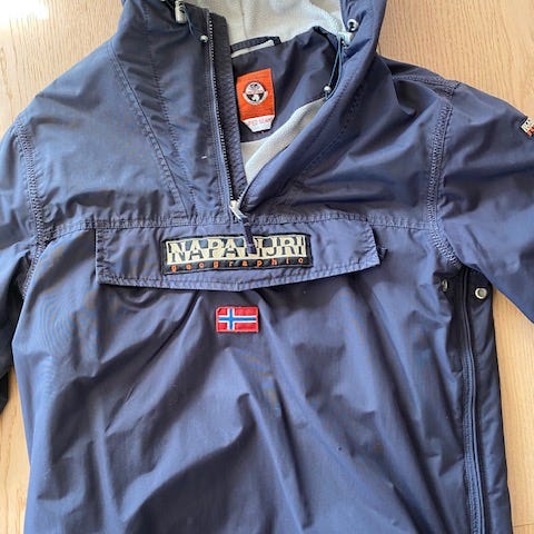 Klassisk Napapijri anorakk jakke for dame i størrelse M. Jakken er blå med Napapijri-logo og norsk flagg på brystet.