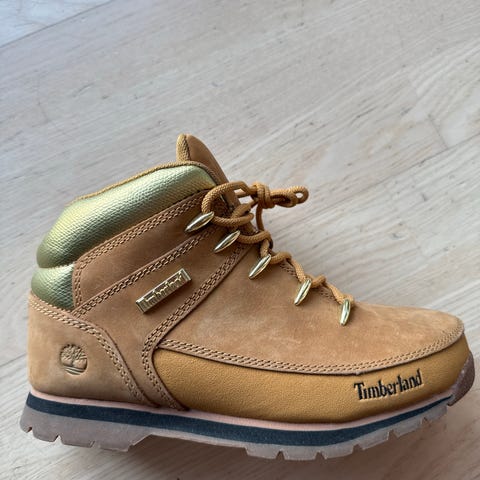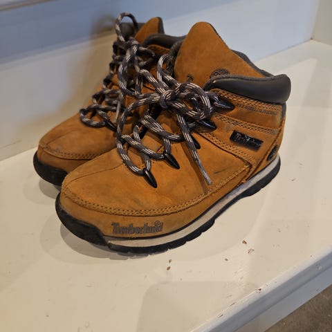 Timberland tursko for barn i størrelse 27. Skoene er i brun farge med sorte lisser og mørk polstring rundt ankelen. Overdelen er i skinn med kraftige metallhemper til lissene. Sålen er mønstret for bedre grep. Modellen er beregnet på gutt, men kan brukes av alle barn som trenger solide sko til utebruk og tur. Regnes som ny siden ble tatt i bruk et eneste gang 🤷 ♀️