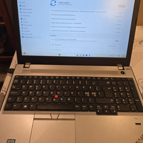 Enheten har tastatur i full størrelse med numerisk tastatur og innebygd styreplate. Skjermen er matt og hengslet til et kabinett i mørk plast. På håndleddstøtten finnes klistremerker som indikerer AMD-prosessor og Radeon-grafikk.