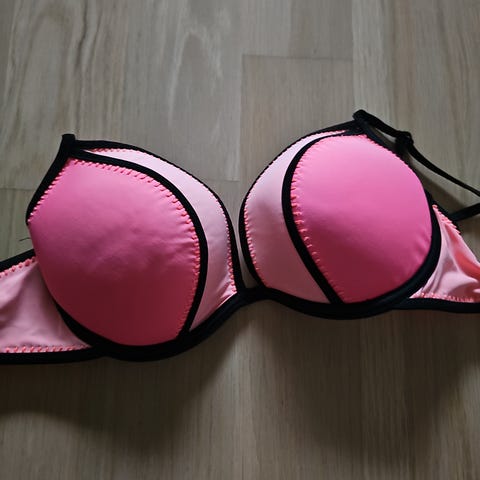 Bikini-bh for dame i størrelse M. Modellen er i svart polyester med strukturert overflate. Bhen har vatterte skåler og halterneck-knyting i nakken. Bak har den elastisk parti med lukning. Egnet som overdel til bikini eller til å kombineres med annen matchende underdel etter ønske.