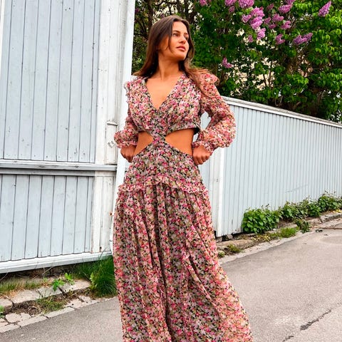 Selger maxikjole fra Love Lolita i strl S. Det er en wrap-kjole, så «fleksibel» størrelse. Nydelig rosa/hvitt blomstermønster. Kun brukt en gang.