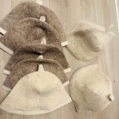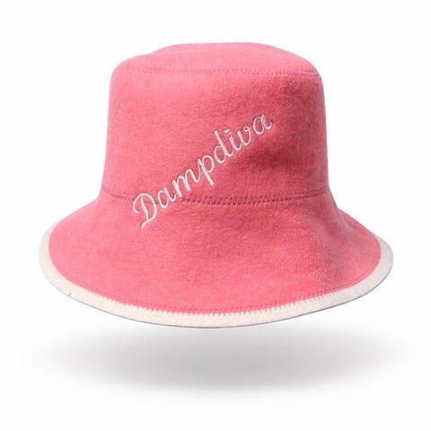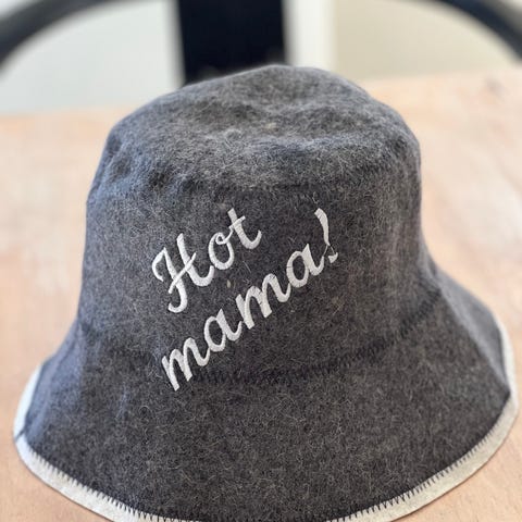Badstuhatt . Hatten har hempe øverst for enkel opphenging og brodert tekst på siden. Egnet for bruk i badstue for å beskytte hodet mot varme. Unisex-modell som passer de fleste voksne.