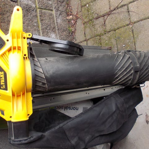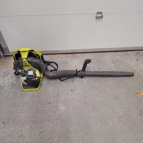 Blåser og suger inn løv. Kun brukt et par ganger, pent brukt. Selges pga. lite bruk