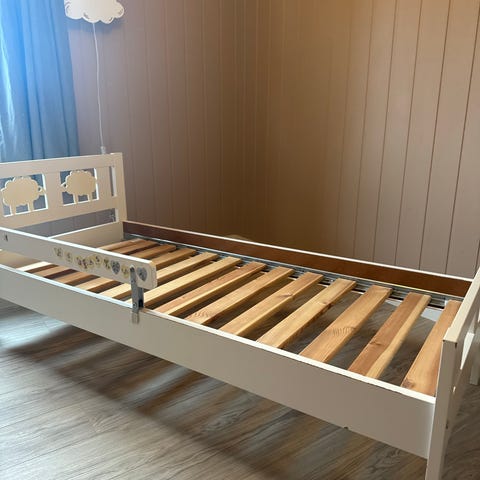Barneseng med madrass, overmadrass 1 sateng laken, sengekant 354 cm, og 2 laken.