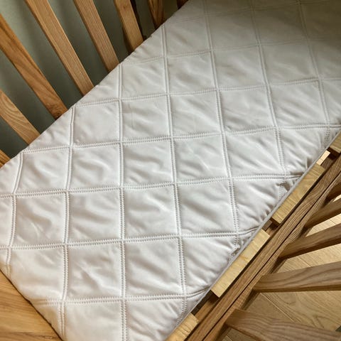 barneseng med madrass og overmadrass, sengekant, overmadrass, og 2 laken