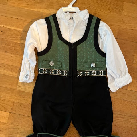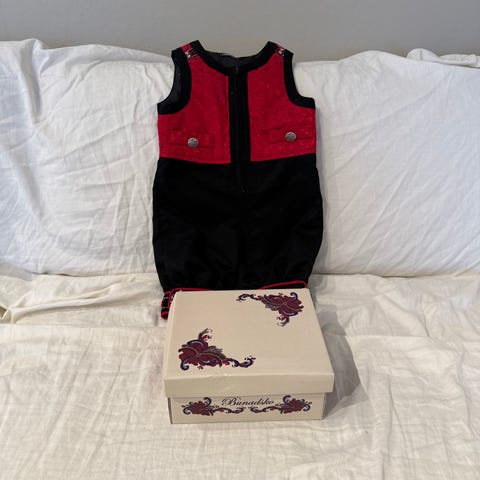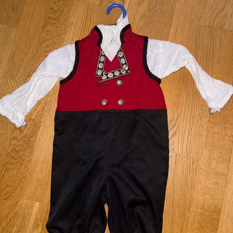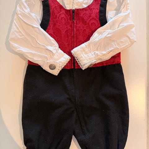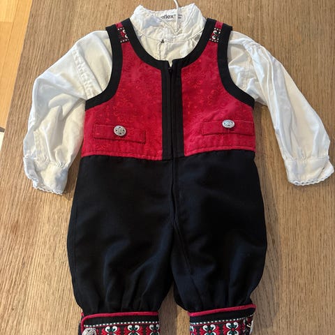 Reflex bunad dress for gutt i størrelse 80 cm Plagget er laget i bomull og består av buksedel og vest i ett, med tilhørende skjorte. Bunaddrakten er flerfarget med mørk bukse, rød vestedel med mønster og dekorbånd nederst på bena. Skjorten er lys med krage og mansjetter. Egnet som penklær til høytider og spesielle anledninger for små gutter i størrelse 80 cm
