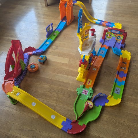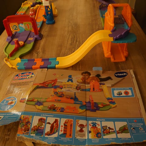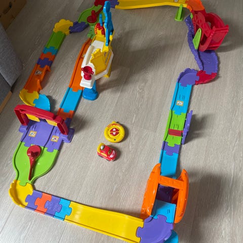 Selger lite brukt Toot-toot drivers bilbane med alle deler. Fjernstyrt bil og kontroll følger med. Banen inneholder flere smartpoints hvor det kommer lyder og skjer ting når man kjører over de. Den har også en automatisk heis og vugge. Kan bygges i flere varianter. Ny pris 937 uten bil og fjernkontroll. Selges samlet for 400 kr med bil og fjernkontroll. Bruker ikke fix ferdig. Hentes på Fevik/ Grimstad