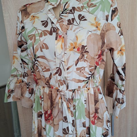 Studio sommerkjole i størrelse 40 for dame. Kjolen er laget i viskose og har et flerfarget blomstermønster på lys bunn. Modellen har lange ermer med mansjett og knapp, knapperekke i front og et løst, ledig snitt med volanger i skjørtet. Passer til bruk på varme dager eller som en lett kjole til hverdags og fritid. Pent brukt.