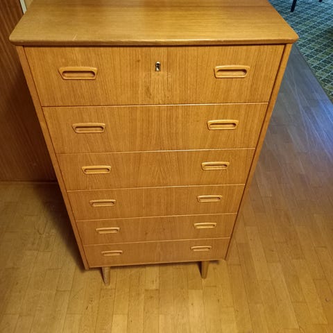Selger en nydelig vintage Teak kommode med gullhåndtak. Har noen bruksmerker, men ellers i veldig fin stand. Bruksmerkene: et svart merke på topp platen, en liten skade på topp platen bakerst, normal slitasje på topp-platen, noen hvite flekker som ikke er forsøkt fjernet. Ene benet har knekt og er limt med trelim, fungerer helt fint nå og er stødig, men må løftes ved flytting og ikke skyves. Mangler nøkkel. Mål: B80cm, H114cm, D39cm.