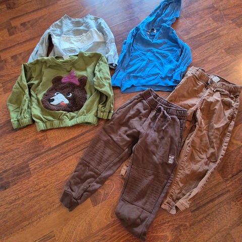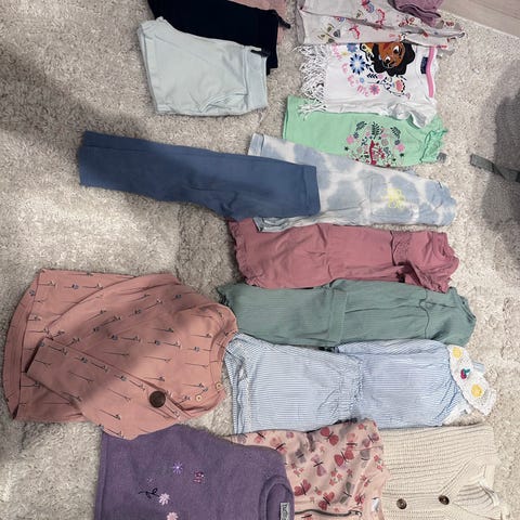 Synlig brukt med noen flekker. Favorittbuksene er slitt på kneet og strømpebuksenhsr et lite hull (se bilde).