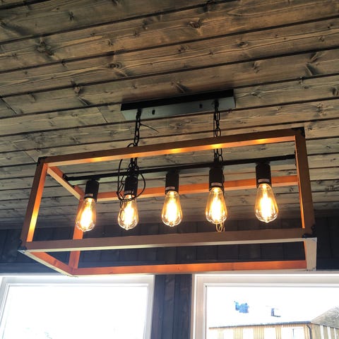 Taklampe brukt på hytte. Ekstra lengde på kjetting som er justerbar.