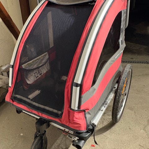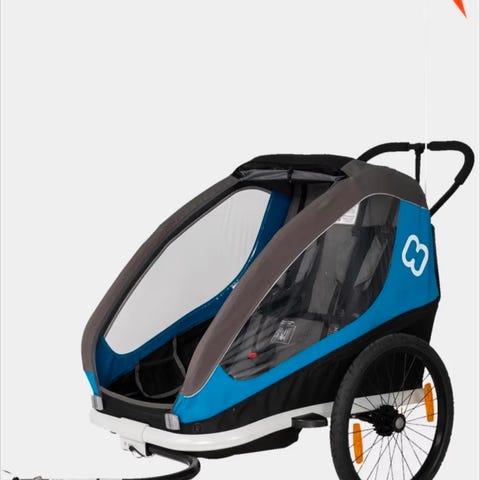 Vognen kan brukes både som sykkeltilhenger, barnevogn til tur, joggevogn og pulk. Metallramme og tekstiltrekk med flere ventilasjonsåpninger. Det følger med drag til sykkeltilkobling og ekstra hjul/utstyr som vist på bildene.