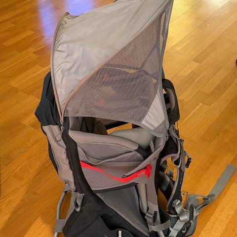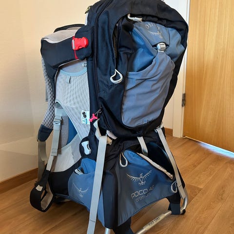Osprey Poco bæremeis i blå og grå farge. Bæremeisen har justerbart bæresystem med polstrede skulderstropper, hoftebelte og brystreim. Rygglengden kan tilpasses bæreren, og barnet sitter i et polstret sete med seler og støtte rundt hodet. Modellen har netting i ryggen for ventilasjon, flere justerbare stropper og støttebøyle som kan felles ut slik at meis kan stå stødig på gulvet. Det er flere lommer og oppbevaringsrom på siden og under setet til utstyr og bagasje. Egner seg til tur og hverdagsbruk der barn skal bæres over lengre distanser.