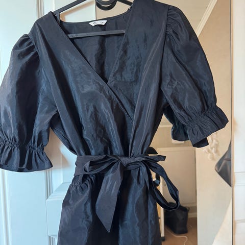 mbyM Melika-M hverdagskjole for dame i størrelse M. Kjolen er svart og laget av bomull. Modellen har omslagssnitt med v-utringning og knyting i livet, samt ermer som går til omtrent albuen. Egnet som hverdagskjole eller til enkle anledninger.